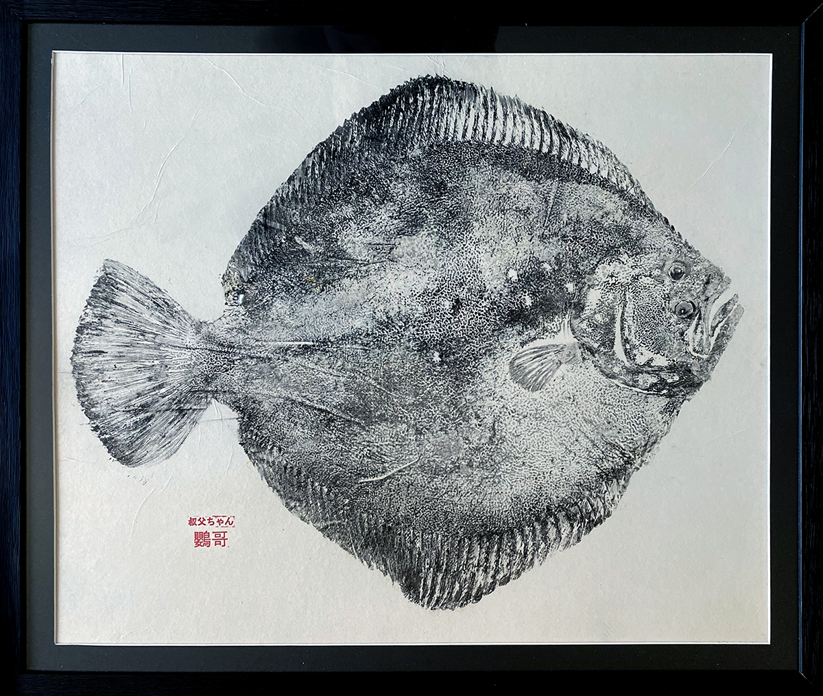 Gyotaku de Turbot par Nicolas PERRUCHE / Encre de seiche / papier de riz / marouflé & encadré / 70x59cm